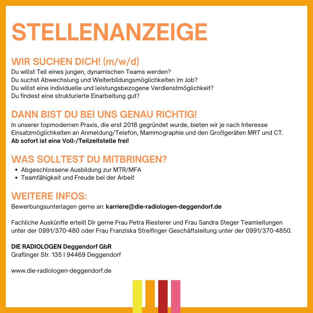 Gerne können Sie uns eine Initiativbewerbung als MTR/MFA (m/w/d) zukommen lassen! Wir freuen uns von Ihnen zu hören.